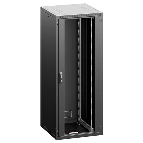 Передняя дверь выполнена из закаленного стекла в стальной рамке, снабжена поворотной ручкой с замком и открывается на угол до 180°. Дверь легко переставляется для открытия в нужную сторону. Съемную заднюю панель с кабельными вводами при необходимости можно заменить на перфорированную или вентилируемую дверь. Боковые панели также съемные и оборудованы замками, что упрощает доступ к оборудованию и повышает безопасность.